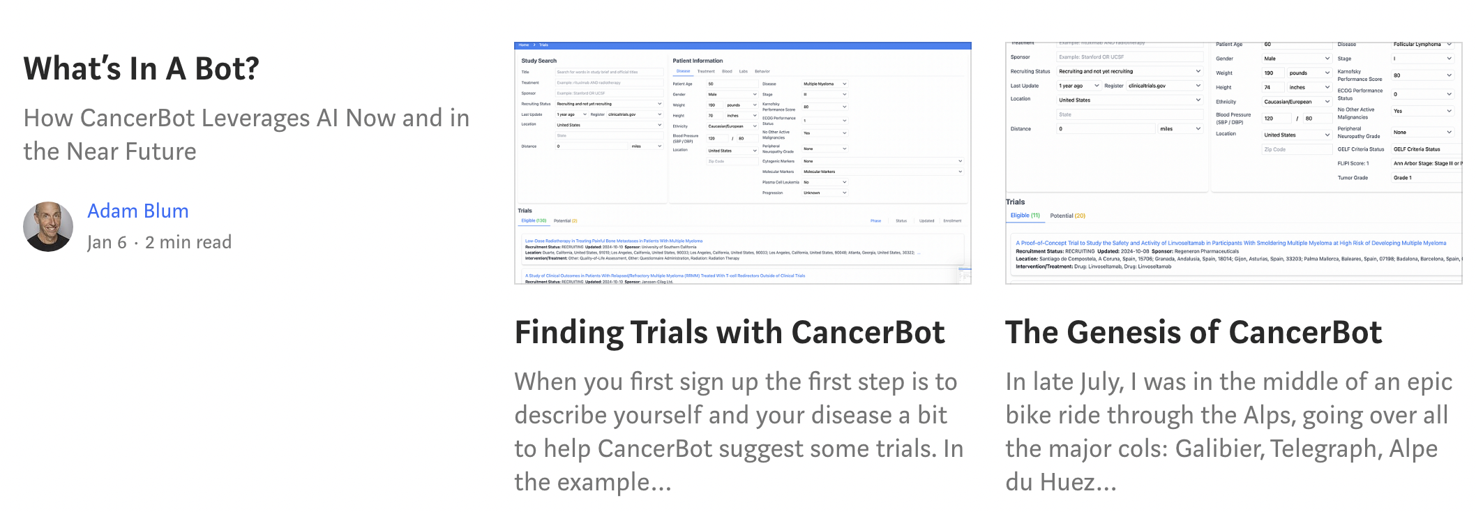 I started CancerBot after being diagnosed with follicular lymphoma. As an AI tech-company founder, I thought I would certainly be able to find the best possible "new technology" to address my disease. My doctors were actively hostile to the idea of trials. So I spent time on all the major clinical trial search services, which took many hours. The difficulty finding matches is the primary reason only 2% of patients sign up for trials. This stops patients from benefiting from advanced treatments and holds back scientific progress.